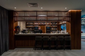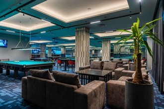 Клуб расположен по соседству с рестораном авторской кухни Public, а вблизи столов расположен бар.